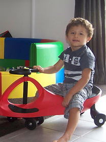 Pacôme, atteint du Syndrome d'Angelman, en plein apprentissage de l'équilibre sur le 'Plasma car' - Action "Apprendre par le jeu"